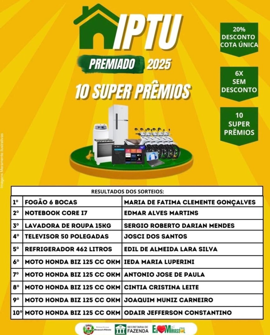 De acordo com a Prefeitura, o IPTU Premiado integra o programa de incentivo fiscal municipal, que também garantiu aos contribuintes 20% de desconto para pagamento em cota única e a possibilidade de parcelamento em até 6 vezes sem desconto. A iniciativa busca fortalecer a arrecadação municipal e, ao mesmo tempo, reconhecer o esforço dos moradores que mantêm seus tributos em dia.