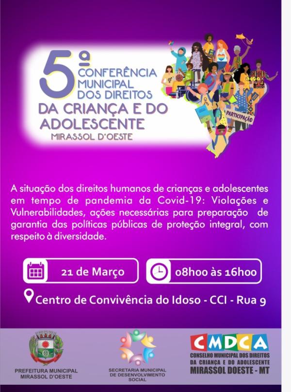 A 5ª Conferência Municipal dos Direitos da Criança e do Adolescente de Mirassol d'Oeste-MT, será realizado dia 21 de março 2023. Local: CCI - Centro de convivência do idoso rua 09 no bairro Jardim São Paulo, das 08:00 às 16:00 horas. Terá como tema “Situação dos direitos humanos de crianças e adolescentes em tempos de pandemia da Covid-19: violações e vulnerabilidades, ações necessárias para reparação e garantia de políticas de proteção integral, com respeito à diversidade.” e será desenvolvida conforme tema e eixos orientadores, definidos pelo CONANDA, e constantes do Documento Base da XII Conferência Nacional dos Direitos da Criança e do Adolescente, a saber: