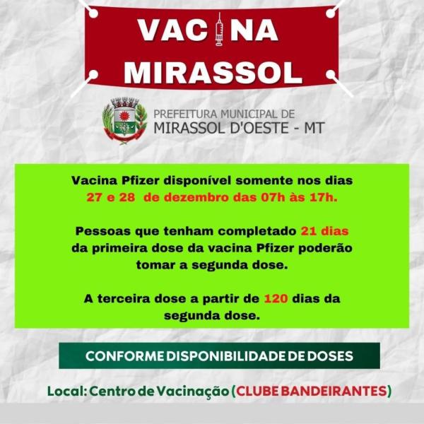 A Secretaria de Saúde de Mirassol d’Oeste -MT comunica que, a Vacina Pfizer estará disponível somente nos dias 27 e 28 de dezembro das 07h às 17h.