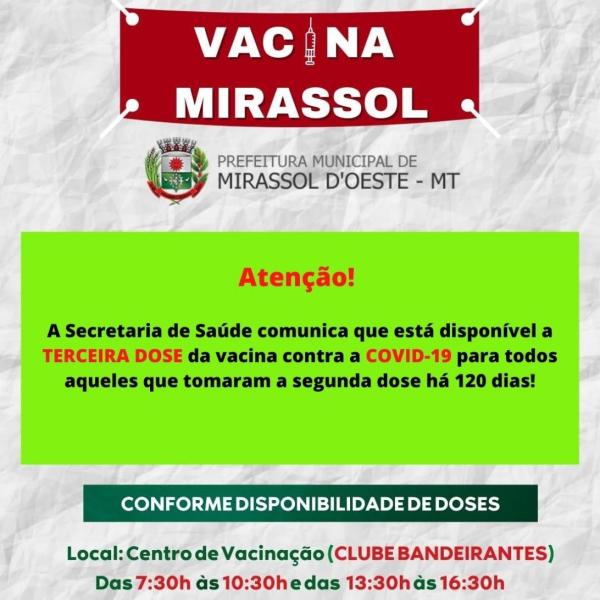 A Secretaria de Saúde comunica que está disponível a TERCEIRA DOSE da vacina contra a COVID-19 para todos aqueles que tomaram a segunda dose há 120 dias!