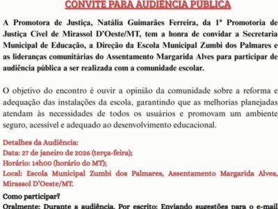A Prefeitura de Mirassol d’Oeste informa que foi realizada, no dia 27 de janeiro de 2026, às 14h, uma audiência pública para discutir a reforma e adequação da Escola Municipal Zumbi dos Palmares, no Assentamento Margarida Alves.