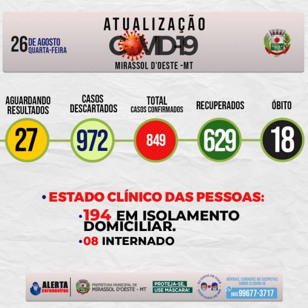 Estado clínico das pessoas: 194 em isolamento domiciliar, 08 Internados, 18 óbito, 629 estão Recuperados.