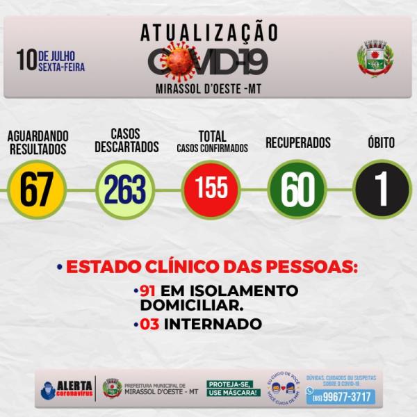 Estado clínico das pessoas: 91 em isolamento domiciliar, 3 Internados, 1 óbito, 60 estão Recuperados.