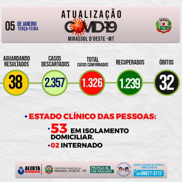 Estado clínico das pessoas: 53 em isolamento domiciliar, 02 Internados, 32 óbitos, 1.239 estão Recuperados.