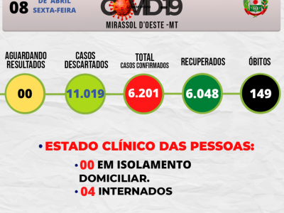 11.019- Casos Descartados 00- Suspeitos 6.201 - Confirmada 6.048- Recuperados 149 - Óbitos