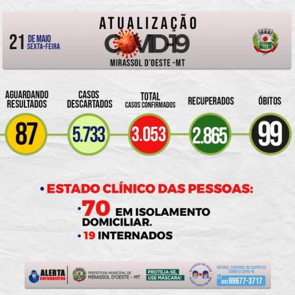 Estado clínico das pessoas: 70 em isolamento domiciliar, 19 Internados, 99 óbitos, 2.865 estão Recuperados.
