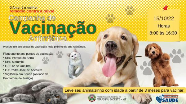 No dia 15/10/22, sábado, das 8:00 às 16:30, acontecerá a campanha de vacinação contra raiva para cães e gatos .
