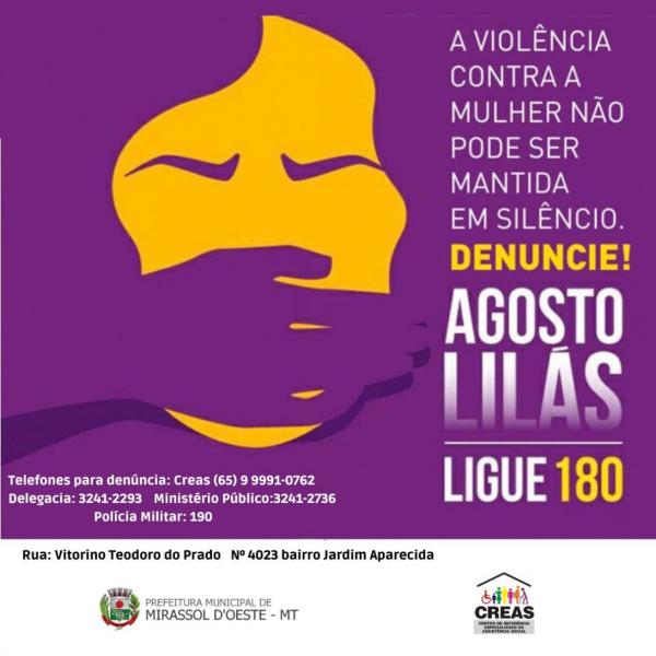 O CREAS de Mirassol D'Oeste adere a Campanha do Agosto Lilás, mês de proteção e de combate à violência contra a mulher. Nossa Campanha será compartilhada com o público por meio das plataformas digitais e pelas redes sociais da Instituição e do município. Mirassol D'Oeste unido pelo respeito às mulheres!