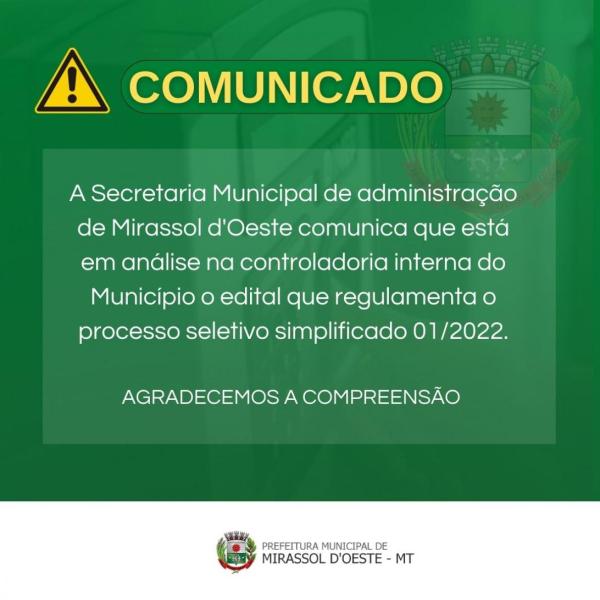 A Secretaria Municipal de administração de Mirassol d'Oeste comunica que está em análise na controladoria interna do Município o edital que regulamenta o processo seletivo simplificado 01/2022.