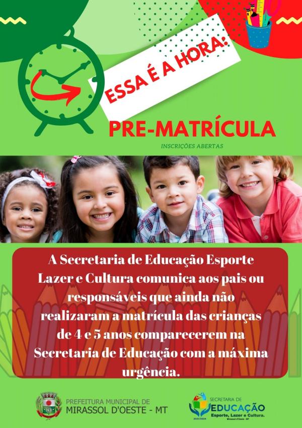 A Secretaria de Educação Esporte Lazer e Cultura comunica aos pais ou responsáveis que ainda não realizaram a matrícula das crianças de 4 e 5 anos comparecerem na Secretaria de Educação com a máxima urgência.
