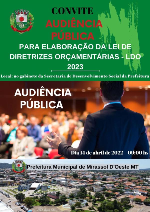 O Prefeito do Município de Mirassol D´Oeste Estado de Mato Grosso, HECTOR ALVAREZ BEZERRA,vêm a público, em atendimento ao disposto no Parágrafo Único do Art. 48, da Lei 101 de 04 de maio de 2000 (LRF), para convocar todos os cidadãos miradolensesà participarem da Audiência Pública para apresentação e discussão da proposta da Lei de Diretrizes Orçamentária - LDO/2023, no gabinete da Secretaria de Desenvolvimento Social da Prefeitura Municipal, localizada à Rua Antônio Tavares, nº 3.310, Centro, no dia 14 de abril de 2022, com início às 09:00h.