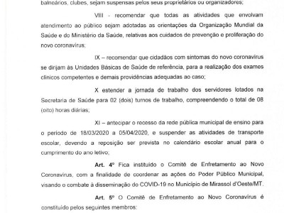 Conforme o Decreto Estadual nº 407, de forma excepcional e com o único objetivo de resguardar o interesse da coletividade na prevenção do contágio e no combate da propagação do coronavírus (COVID-19), A Prefeitura Municipal de Mirassol d’Oeste determina a suspensão, enquanto permanecer o estado de emergência internacional pela doença, das seguintes atividades: