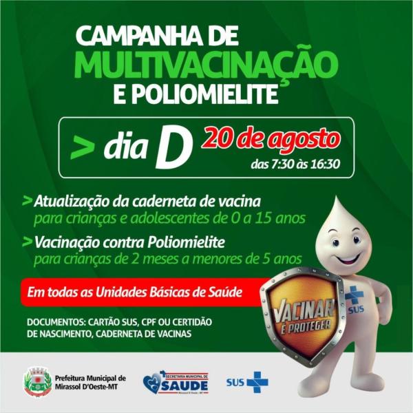 A Secretaria de Saúde comunica que no dia 20 de agosto acontecerá o dia D da vacinação contra Poliomielite e atualização de Caderneta de Vacina de crianças e adolescentes de até 15 anos de idade.