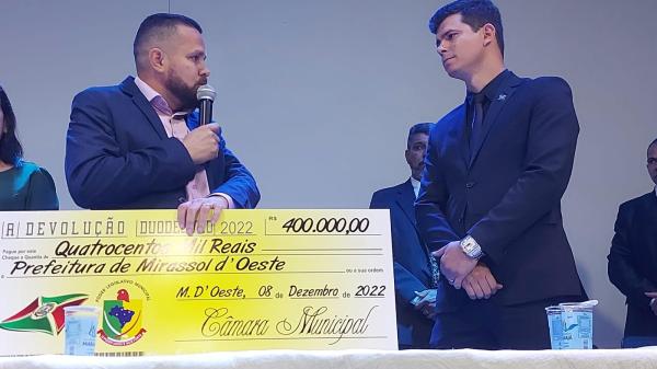 A Câmara Municipal de Vereadores de Mirassol D´Oeste devolveu nesta quarta-feira (14) aos cofres público municipal a quantia de R$ 400.000,00 (Quatrocentos Mil Reais) resultado da economia gerada pelo legislativo ao longo do ano de 2022.