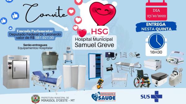Convidamos toda a população para estar presente no dia 27/10/2022, às 16h30min, no Hospital Municipal Samuel Greve, para prestigiarem a entrega de alguns dos equipamentos de estruturação da Atenção Especializada em Saúde, que foram adquiridos por meio da Emenda Parlamentar do Deputado Federal Dr. Leonardo, no valor de R$ 581.927,00.