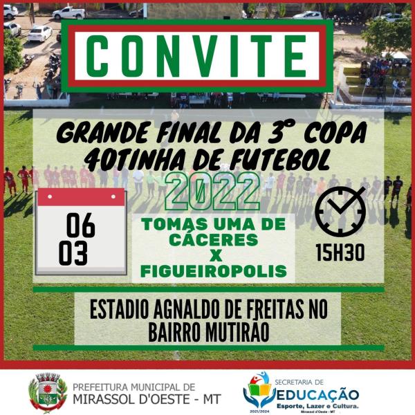 A Prefeitura Municipal de Mirassol D`Oeste através da Gerência Municipal de Esportes, convida você e sua família para prestigiar nesse domingo dia 06 de Março, a partir das 15:30hs no Estadio Agnaldo de Freitas no bairro mutirão a grande final da Terceira Copa 40tinha de futebol, jogo Tomas Uma de Cáceres X Figueiropolis