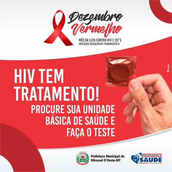 A Secretaria Municipal de Saúde de Mirassol d’Oeste comunica que, para o mês do Dezembro Vermelho, uma campanha de sensibilização será realizada dentro da rotina de todas as Unidades Básicas de Saúde, sendo o atendimento das 7h às 11h e das 13h às 17h.