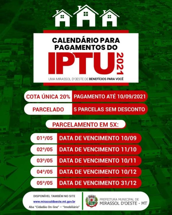 A secretaria de fazenda de Mirassol d'Oeste, por meio do seu secretário Haroldo Greve, informa que, fica prorrogado o prazo constante do artigo 1º do Decreto nº. 3.993, de 28 de maio de 2021, que dispõe sobre a data de vencimento do IPTU/2021.