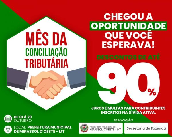 A Secretaria Municipal de Fazenda, por meio do seu secretário Haroldo Greve, informa a todos os contribuintes de Mirassol d'Oeste que estará realizando o Mês da conciliação Tributária agora no Mês de outubro de 2021 entre os dias 1º a 29. Portanto aqueles contribuintes que estão em débito com o fisco municipal, a oportunidade é agora!!!