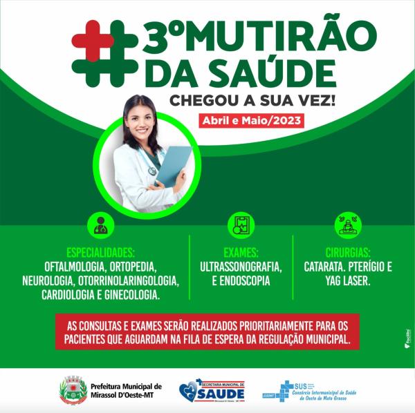 A Secretaria Municipal de Saúde em parceria com o Consórcio Intermunicipal de Saúde do Oeste Mato-grossense realizarão nos meses de abril e maio de 2023 um Mutirão de atendimentos em diversas especialidades médicas, exames e cirurgias.