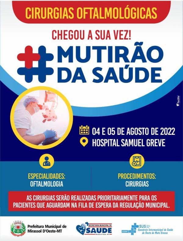 A Prefeitura de Mirassol d'Oeste, através da Secretaria Municipal de Saúde em parceria com o CISOMT realizará nos dias 04 e 05 de agosto de 2022 no Hospital Samuel Greve Cirurgias Oftalmológicas para pacientes que aguardam na fila da Regulação Municipal.