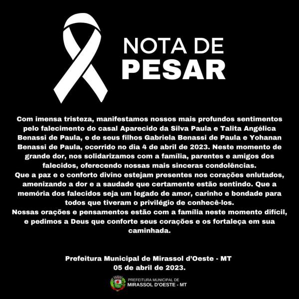 Com imensa tristeza, manifestamos nossos mais profundos sentimentos pelo falecimento do casal Aparecido da Silva Paula e Talita Angélica Benassi de Paula, e de seus filhos Gabriela Benassi de Paula e Yohanan Benassi de Paula, ocorrido no dia 4 de abril de 2023. Neste momento de grande dor, nos solidarizamos com a família, parentes e amigos dos falecidos, oferecendo nossas mais sinceras condolências.
