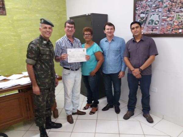 O Delegado 1º Tenente Marco Antônio Carneiro, em reunião com a Chefe interina do Executivo Marinez Campo, o Sr. Joel Greve e o Sr. Carlos Roberto Greve Junior, juntamente com secretários presentes, realizou a entrega de um certificado de agradecimento e honra, ao Sr. Joel Greve, por estar a mais de 30 anos neste ofício.