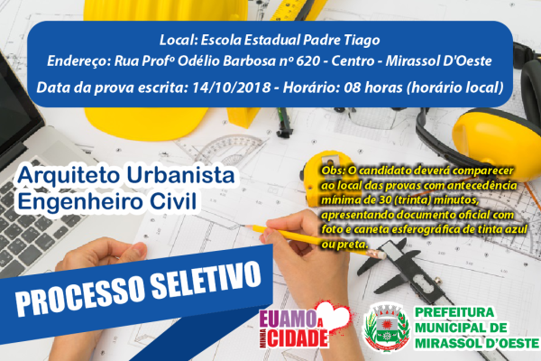 Conforme já esperado, a prova objetiva será realizada no próximo dia 14, às 8h (Horário local), e o local de aplicação da prova escrita será na Escola Estadual "Padre Tiago", Rua Profº Odélio Barbosa nº 620 - Centro - Mirassol D'Oeste. Participam da seleção 209 candidatos, sendo 172 engenheiros civis e 37 arquitetos, que disputam 1 vaga para cada área, sem cadastro reserva.