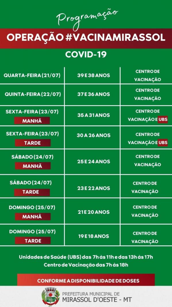 O Centro de Vacinação contra COVID-19 está localizado no Clube Bandeirantes (ao lado da feira), está atendendo das 7:30h às 10:30h e das 13:30h às 16:30h, por livre demanda das respectivas faixas etárias descritas na imagem. Aos munícipes levar os seguintes documento: RG, CPF, CARTÃO SUS E CARTÃO DE VACINA.