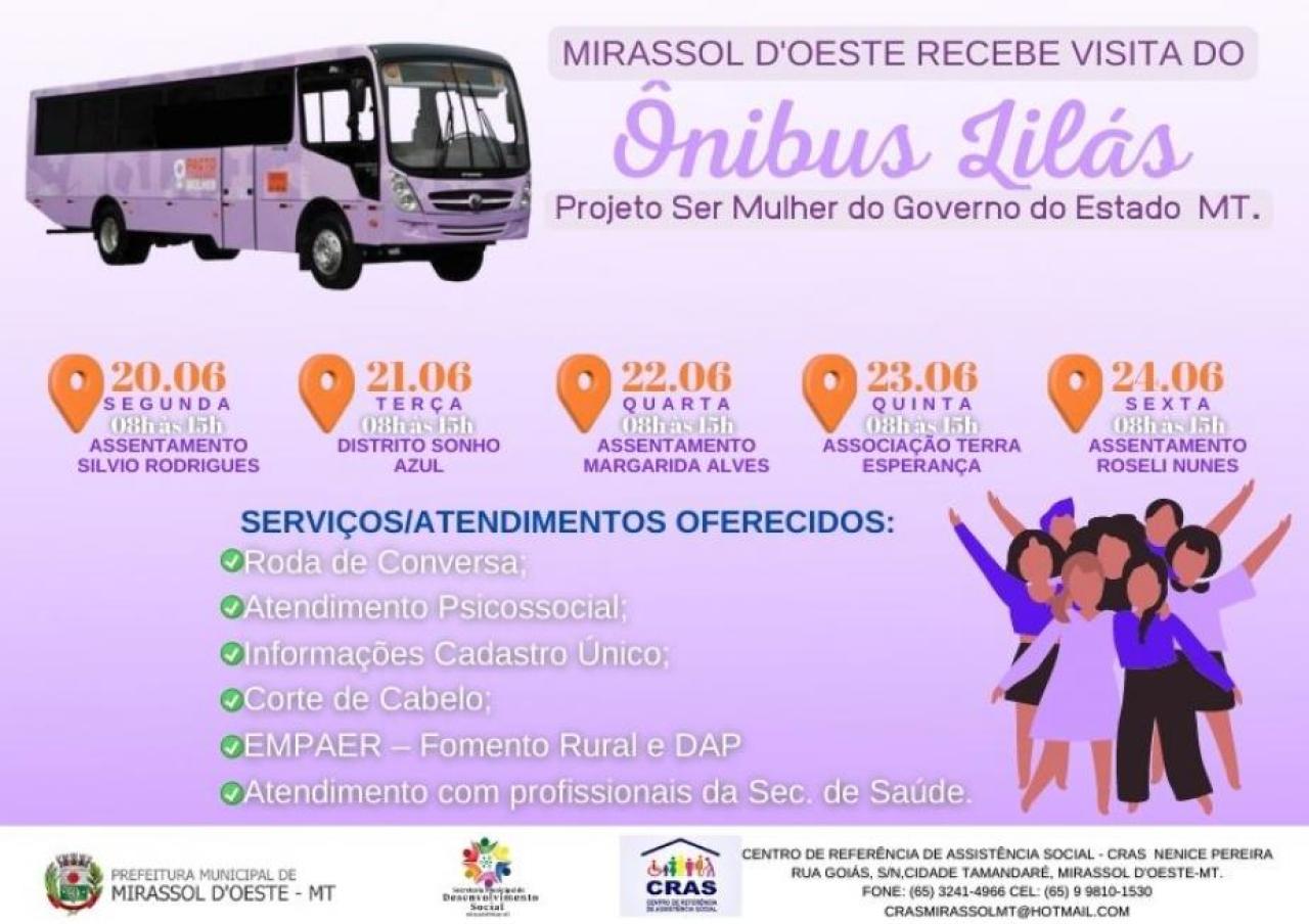 O município de Mirassol d’Oeste recebeu nos dias 20 a 24 de junho de 2022, o Projeto do Ônibus Lilás do Programa SER Mulher, por meio da Secretaria de Estado de Trabalho, Assistência Social e Cidadania (SETASC), em parceria com Prefeitura Municipal de Mirassol d’Oeste e Secretaria Municipal de Desenvolvimento Social juntamente com a Equipe Volante do CRAS.