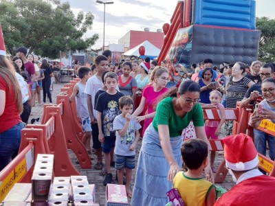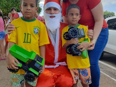 A chegada do Papai Noel com o presente de natal começou pelo distrito do Sonho Azul, onde a garotada já aguardava a caravana.