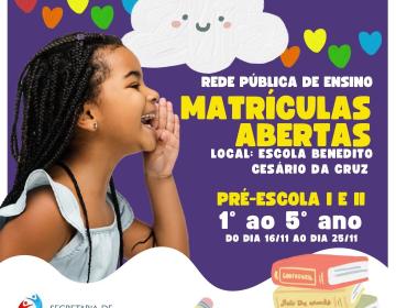 A Rede Pública de Ensino informa que, já estão abertas as matrículas para o ano letivo 2023!